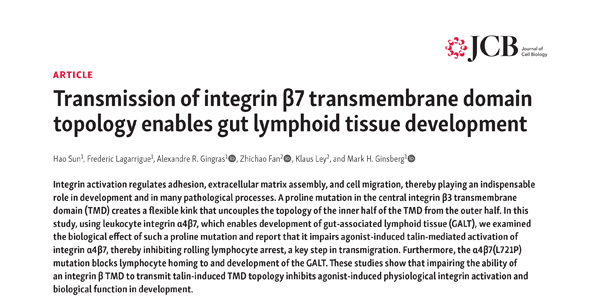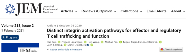 2020年10月27日,加州大學圣地亞哥分校醫學院,聯合法國圖盧茲大學和康涅狄格大學衛生院的科學家在Journal of Experimental Medicine(JEM) 上在線發表了題為Distinct Integrin Activation Pathways for Effector and Regulatory T cell Trafficking and Function的工作(來自作者為孫昊博士)。