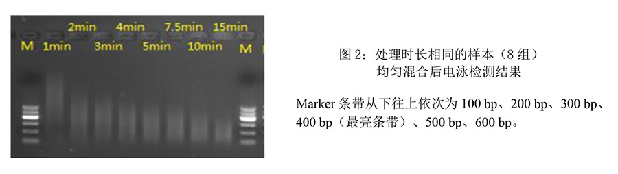 4、相同處理時(shí)長(zhǎng)的樣本混合后,瓊脂糖凝膠電泳檢測(cè)結(jié)果: